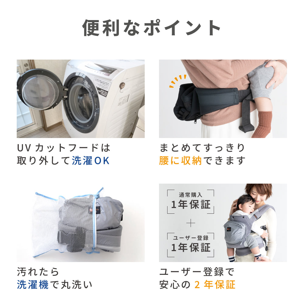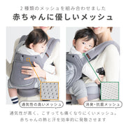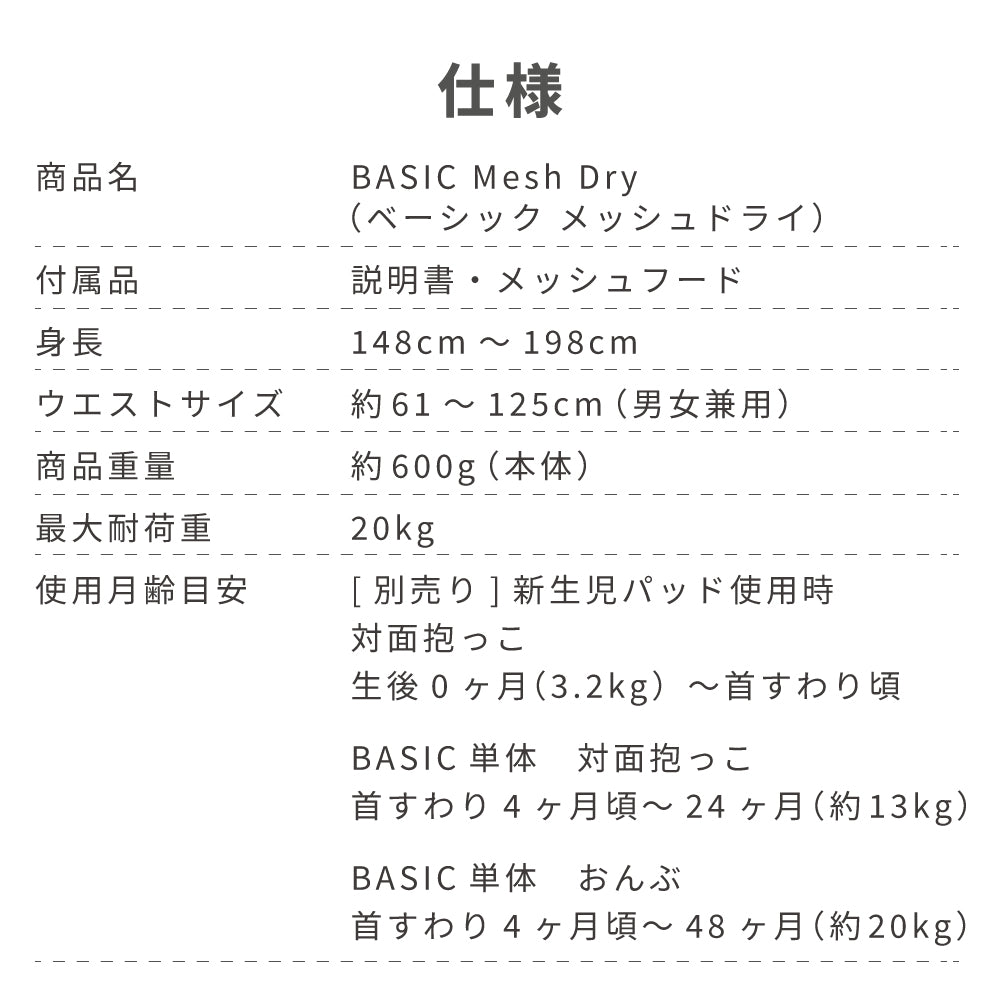 かんたん安全おんぶ/小柄な人にもフィット/大容量ポケット/腰にまとめて収納などのBASICの良いところはそのままに、抜群の通気性を確保したメッシュドライの快適さをぜひ体感して下さい。