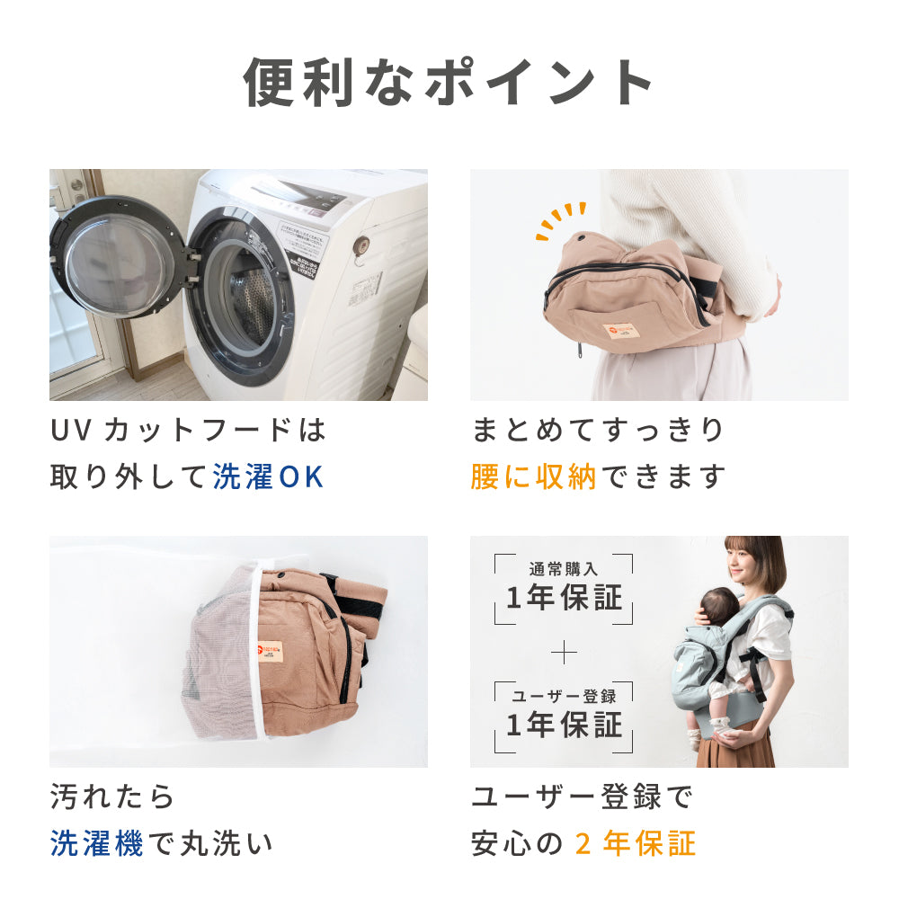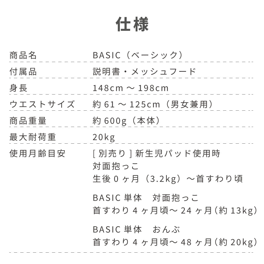 | 使用月齢目安 | 【抱っこ】首すわり4~24ヶ月(約13kg) 【おんぶ】首すわり4~48ヶ月(約20kg) ※36ヶ月から48ヶ月まではSGマーク制度適用対象外です。 |