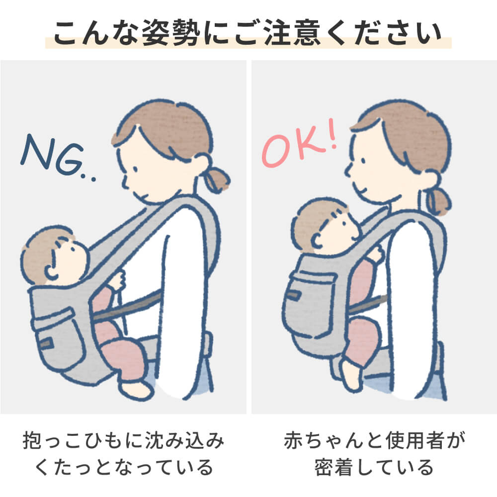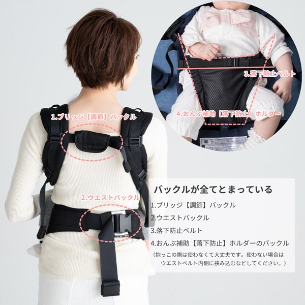ウエストベルトをおへそを中心とした高さでしっかり締め、おでこにあごが付く高さまで赤ちゃんのお尻を持ち上げながら肩ベルトをしめてください。そうすることで赤ちゃんがより軽く感じられます。