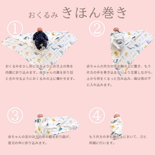 おくるみで赤ちゃんを包むと、適度に手足の動きを制限され、ママのお腹の中にいた時のような安心感を与えます。また、新生児赤ちゃんが手足をビクッと反射的に動かしてしまうモロー反射予防にもなるため、起きてしまう事が少なくなります。