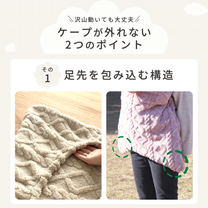 赤ちゃんの足をすっぽり包み込む構造なので、赤ちゃんが足をバタバタさせてもケープから出てしまう心配がありません。